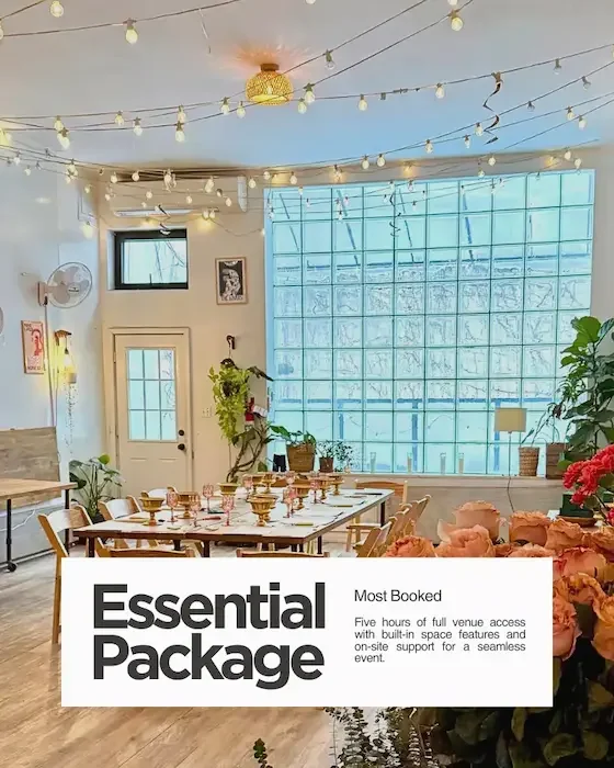 All rentals include tables and chairs for up to 50 guests, setup support, access to our main event room, private downstairs suite, and backyard access depending on package.